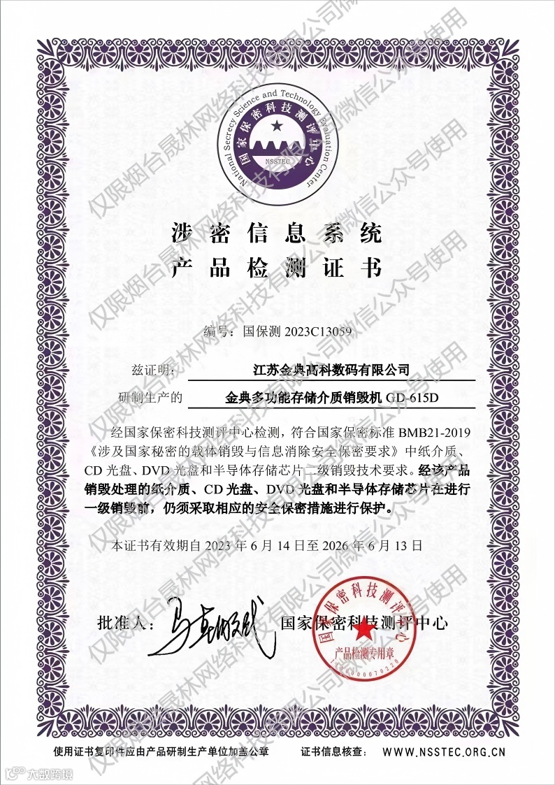 1.符合国家保密标准BMB21-2019《涉及国家秘密的载体销毁与信息消除安全保密要求》二级销毁技术要求