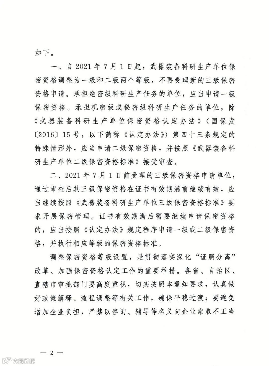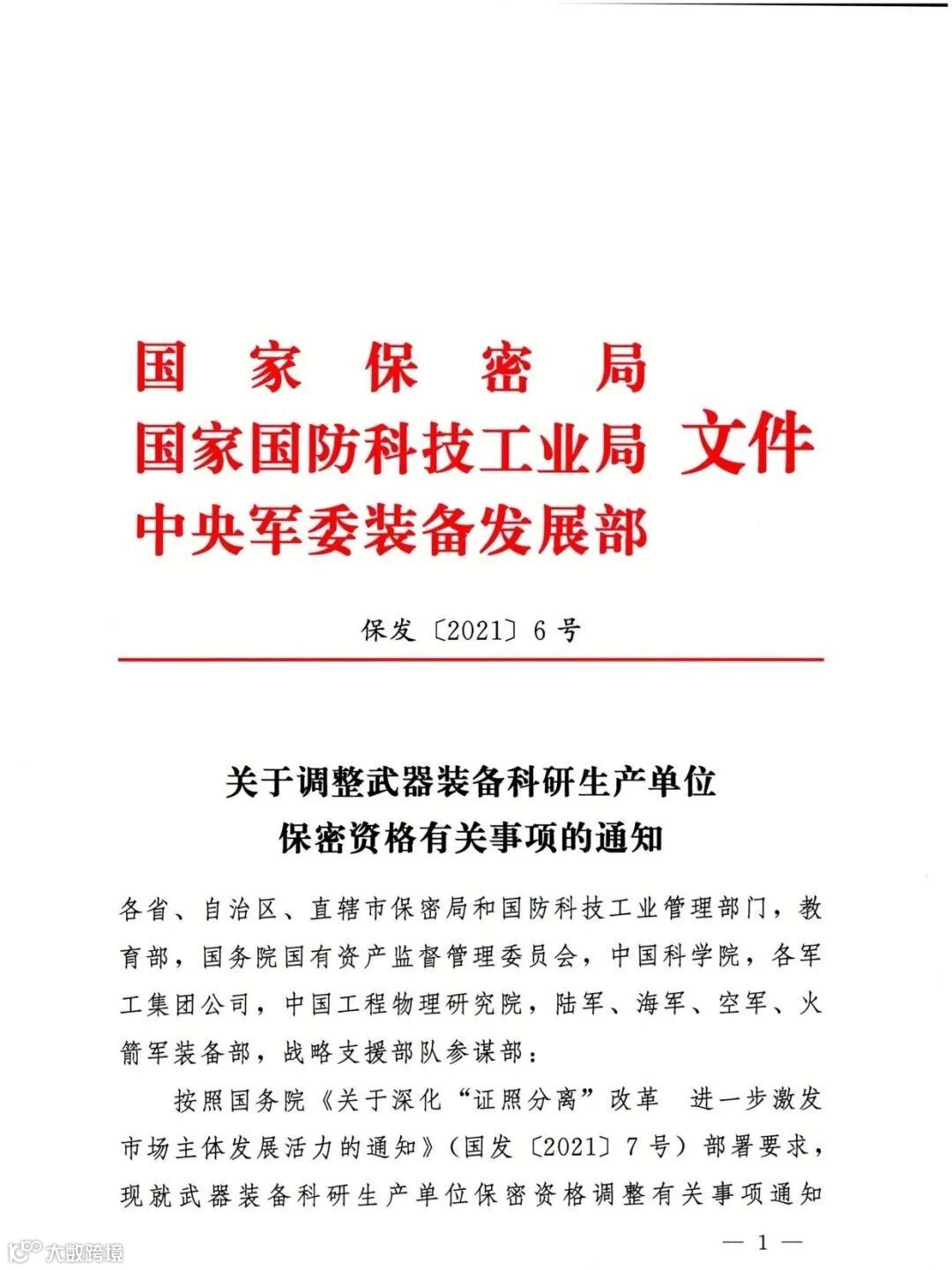 它来了!它来了!关于调整武器装备科研生产单位保密资格有关事项的新政策来了,原文奉上请查看。