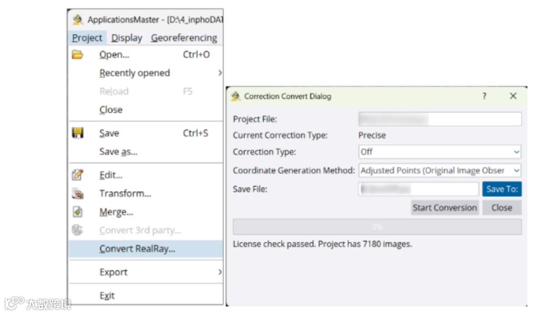 (3)新增支持全新RealRay校正(精确模式)处理的项目进行转换、导出。您可在项目工程菜单下找到。根据项目类型,系统将提供转换至以下模式的选项:标准下视影像工程,简化下视影像工程,关闭(不进行校正),可导出精确计算结果。