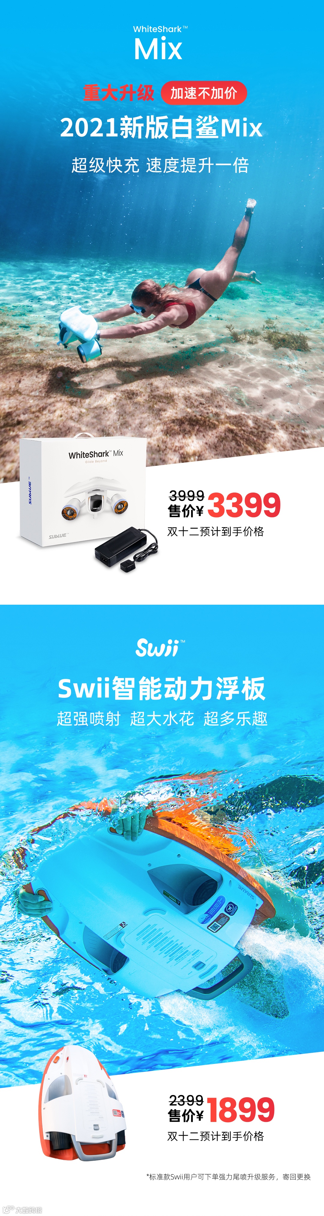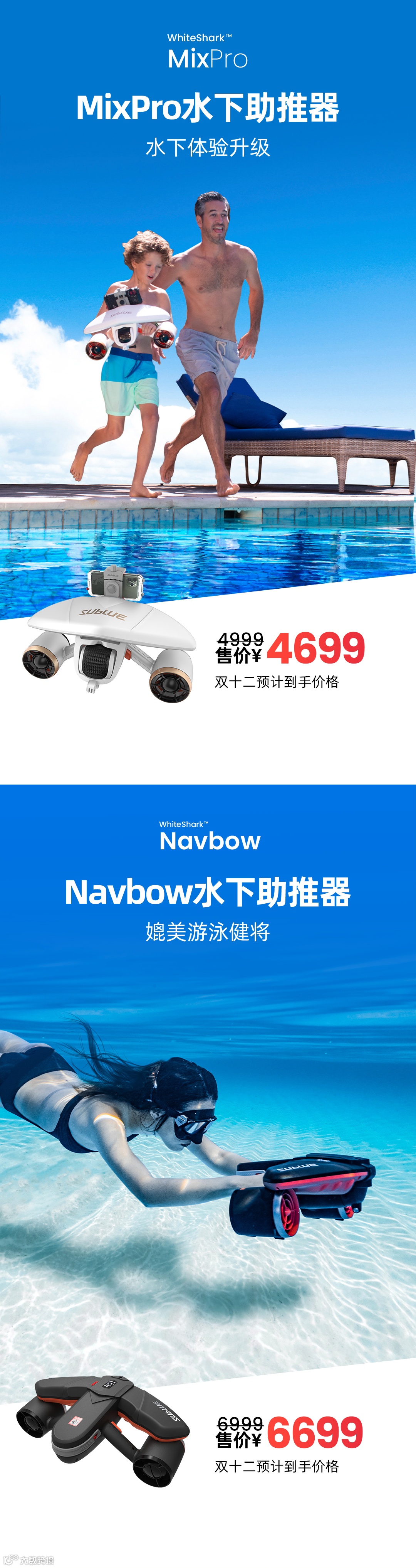 Sublue是深之蓝公司创立的消费级水下智能装备品牌,提供水下助推器、动力浮板、水下无人机等水面、水下运动产品及拍摄套装。小巧体积,强大动力带来前所未有的新奇体验。