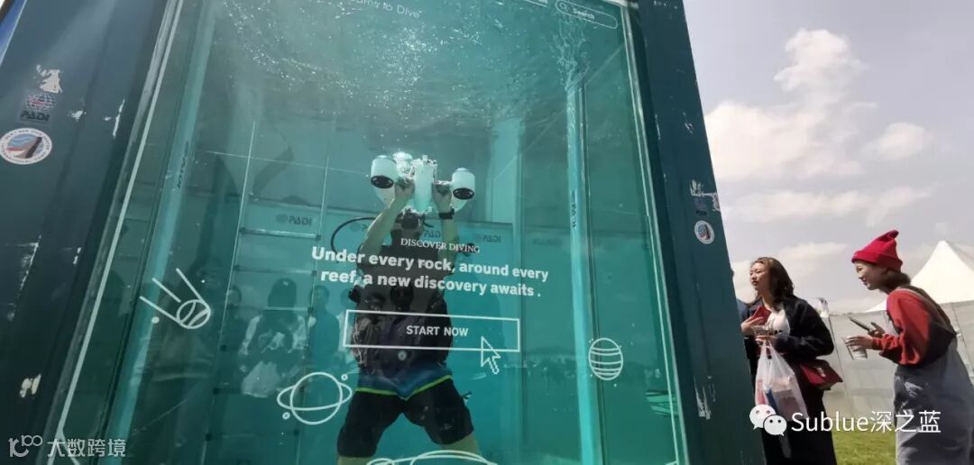 Sublue联合PADI带来水下的奇思妙想 ,巨型泳池、海滩布景 , 潜水员潜水,手持Sublue白鲨Mix水下助推器表演,白鲨Mix科技潮品为音乐节加点料。
