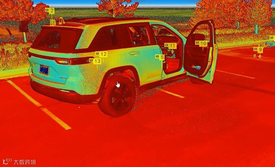 这个场景是使用 Trimble X9 三维激光扫描仪拍摄的,显示了在黑色内饰的白色吉普车上采集到的数据质量。