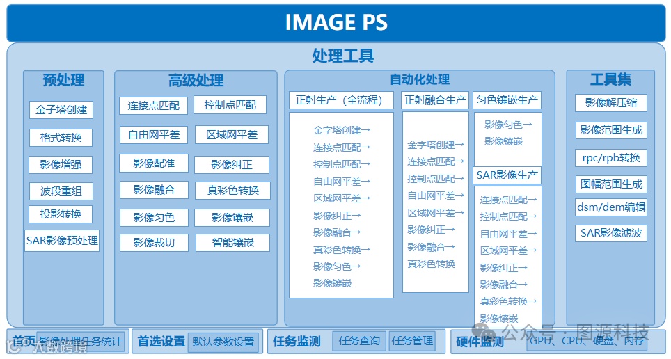 IMAGE PS是一套成熟的多源、海量卫星影像处理系统,具有跨平台、可伸缩、开放可编程化等特点,利用任务调度技术有效利用计算资源,并且结合多线程技术、GPU计算技术 、集群处理技术,大规模提升数据处理效率。具有面向国内外多源遥感影像处理能力,其核心部分是高效匹配算法、高精度光束法平差算法以及自适应负载均衡的数据调度技术。
