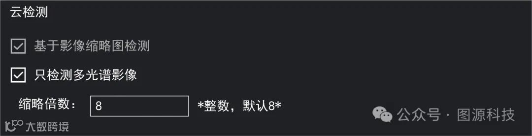 6. 新增云检测功能。可以实现对原始数据进行粗略云含量评估、筛选,并生成云掩模文件。同时可基于影像缩略图检测,提高云检效率,缩略倍数越大,速度越快。