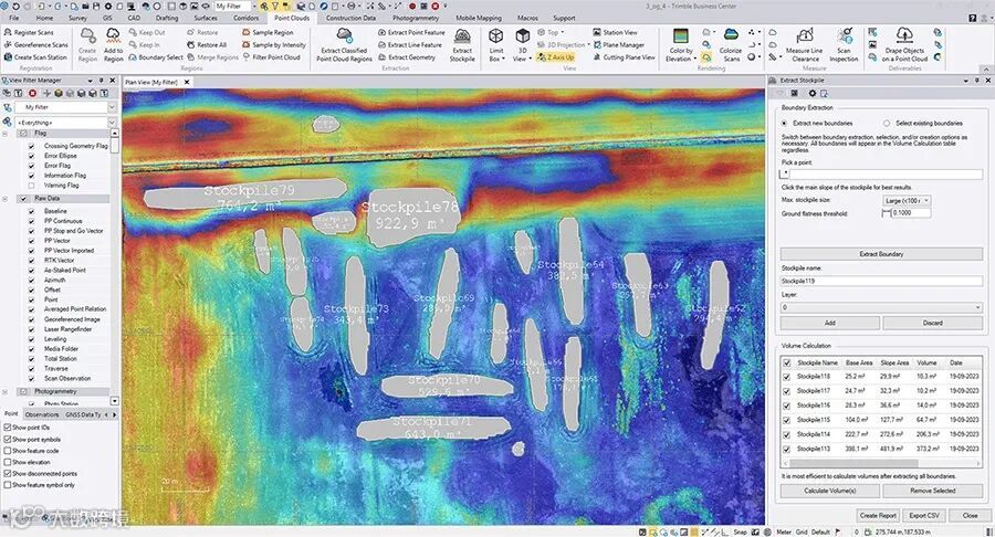 最新版的TBC简化的堆料提取功能可自动提取堆土边界、计算体积并创建包含体积、日期、坡度面积和底部面积的报告,而无需过多的手动交互。要计算TBC中的堆料量,请转到点云选项卡 -> 提取堆土。该命令仅需用户选择点云中堆料的大致位置,剩下的工作都可以交给TBC来完成。
