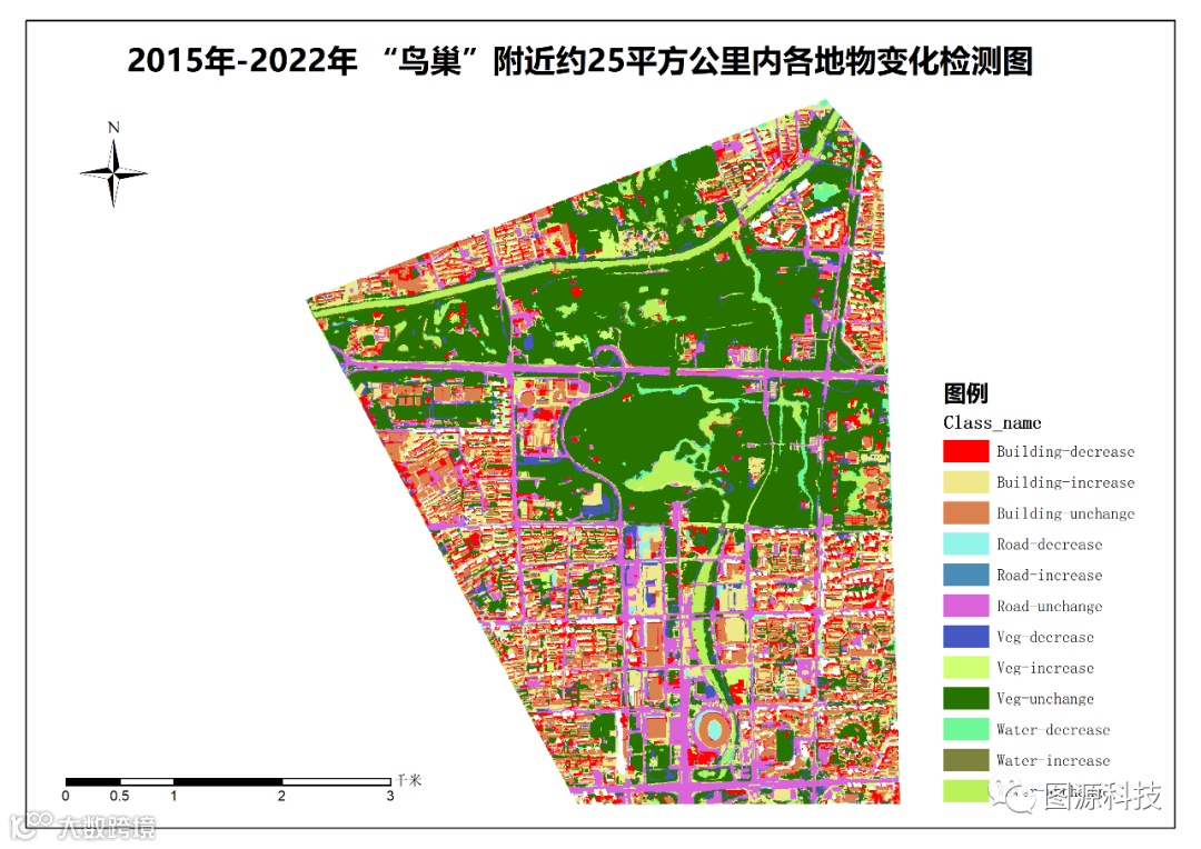 在获得2015年与2022年地物特征分类的基础上,通过遥感智能解译分析软件eCognition中自动变化检测算法生成四类地物特征变化的最终成果。