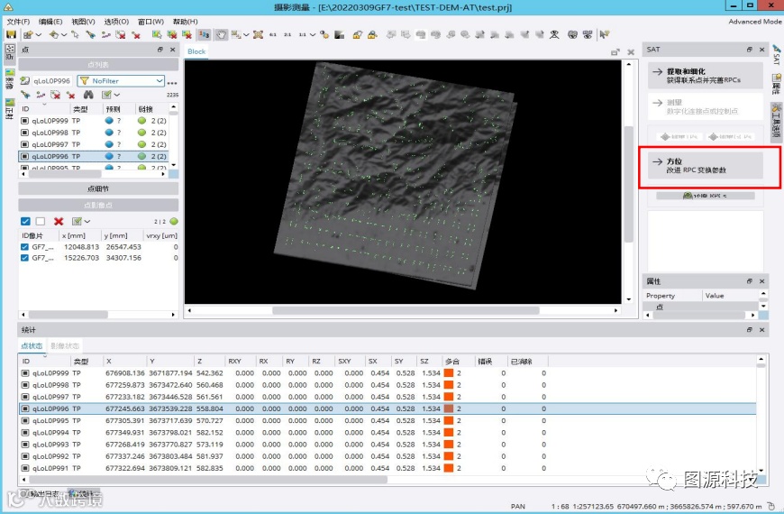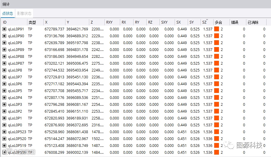(4)检查空三结果是否合格。系统统计的所提取的连接点标准差SX:0.461~0.449,SY:0.531~0.525,SZ:1.537~0.1532。