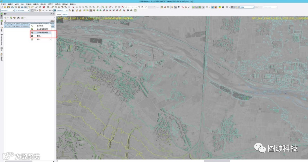 (5)显示立体模式,基于之前的空三成果,显示两景影像的立体效果,将DEM数据套合在立体场景下,可以更直观、准确的分析地物变化,同时在立体下也可以对DEM进行编辑,需要说明的是,立体模式下需要佩戴立体眼镜显示。