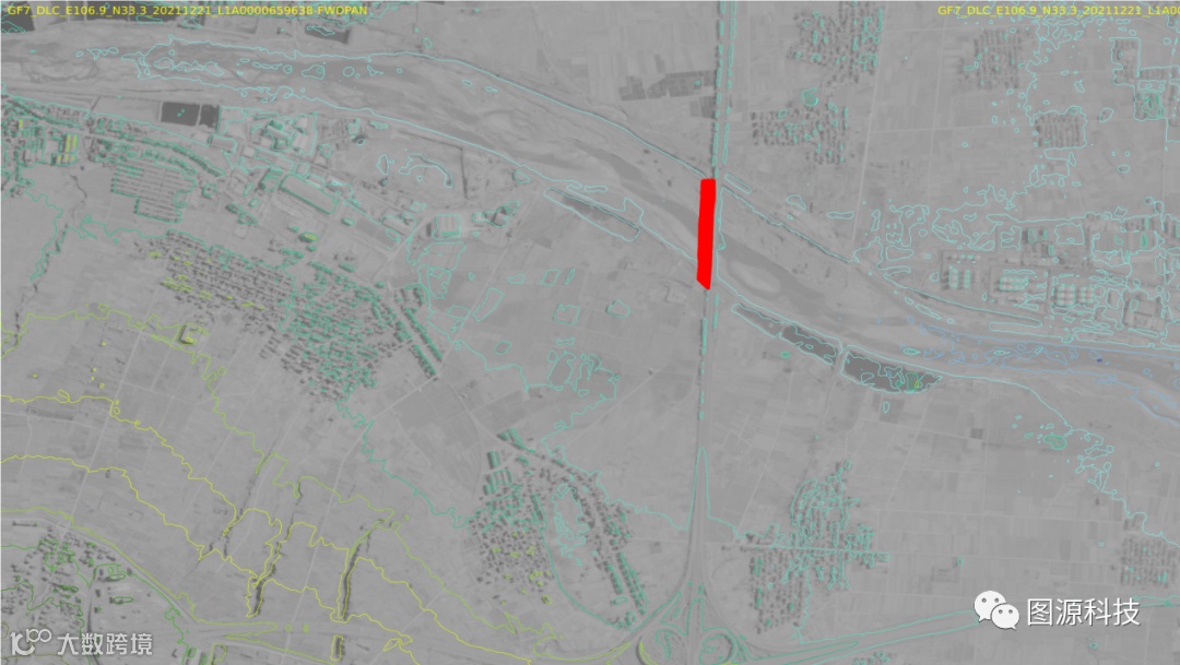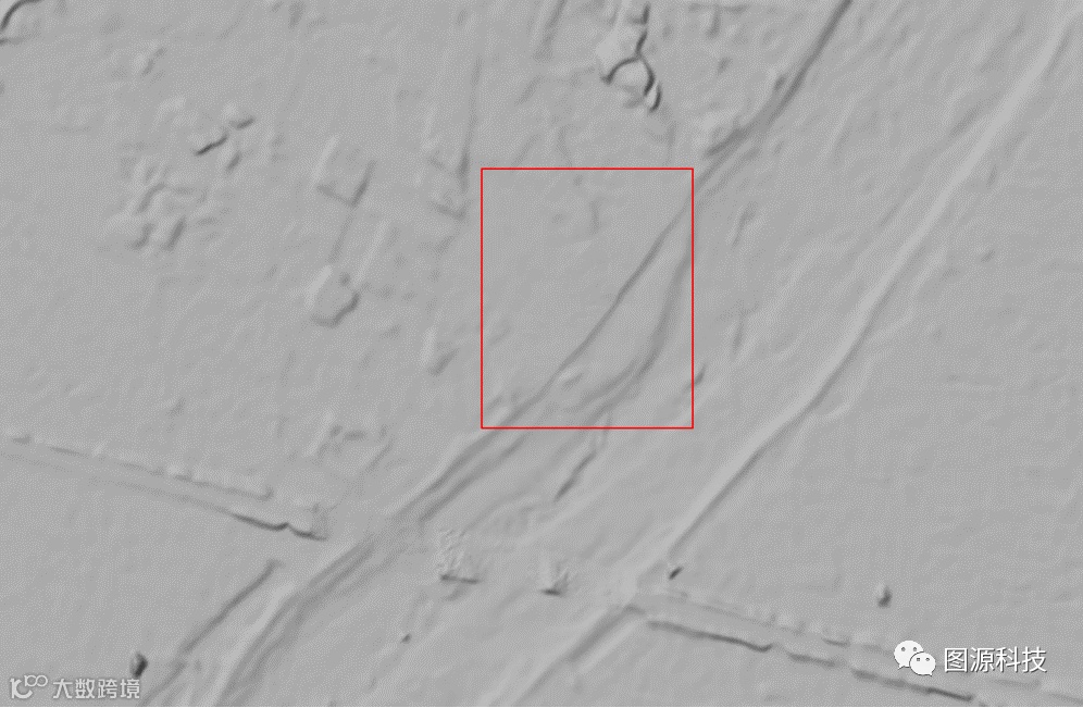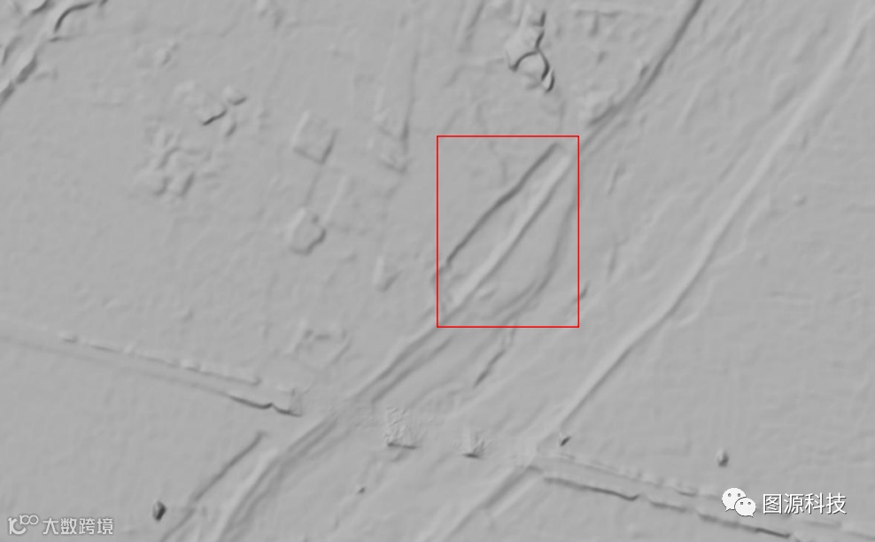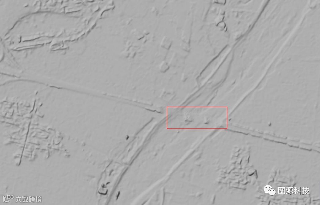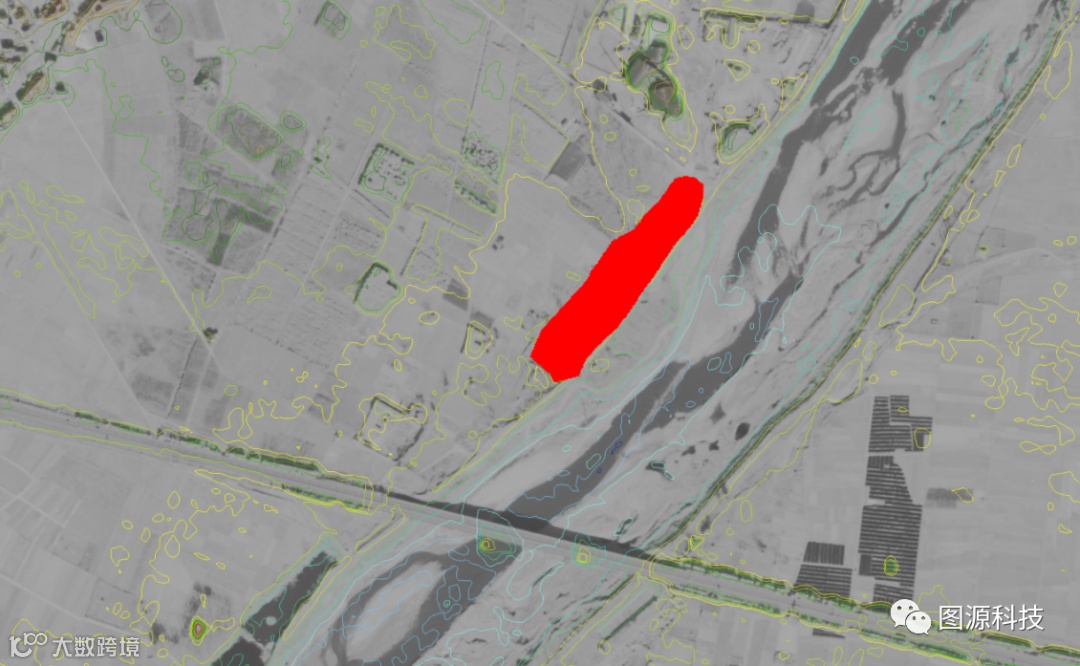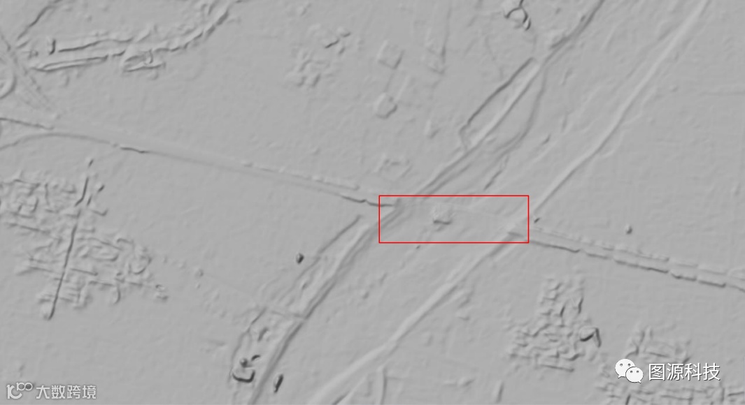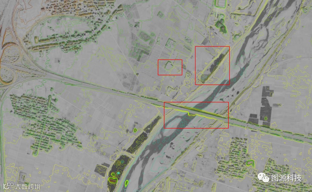 (4)首先在等高线的模式下,放大到地物细节,可以在二维状态下观察DEM与实际地物之间的变化。此处我们以红框处的桥面、基坑、土丘为模拟对象进行编辑、更新。
