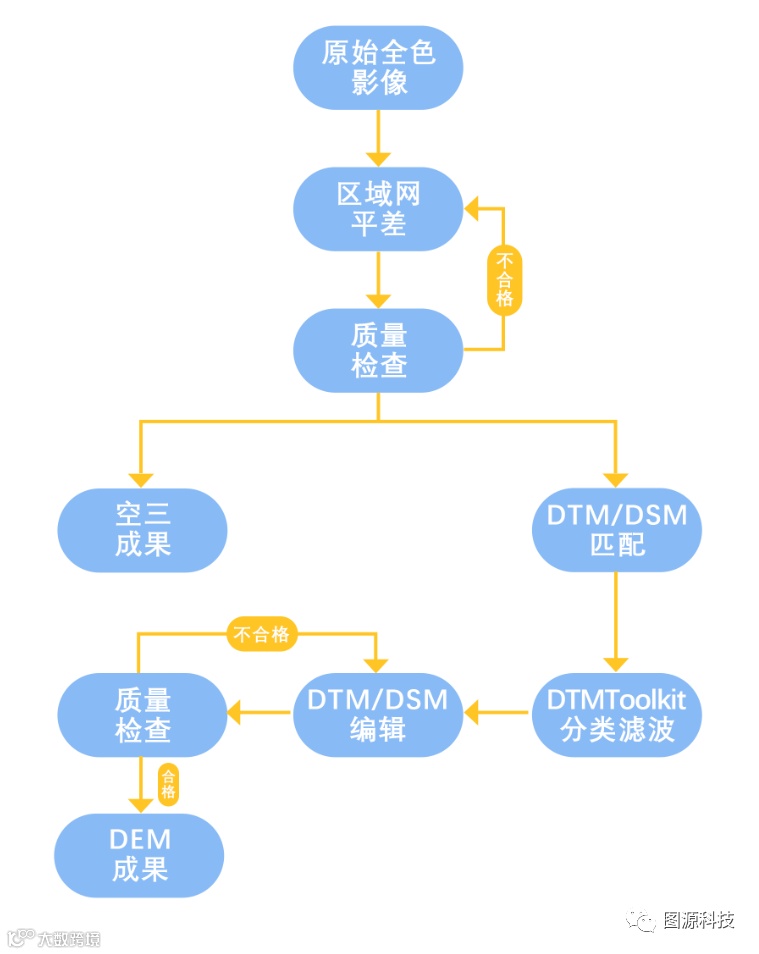 可以采用已有的空三成果数据,也可以从原始数据重新进行空三加密。本次以原始数据为例,首先基于全色立体像对影像进行空三加密,具体的数据处理流程如下图所示。(本次仅就空三加密流程进行处理)