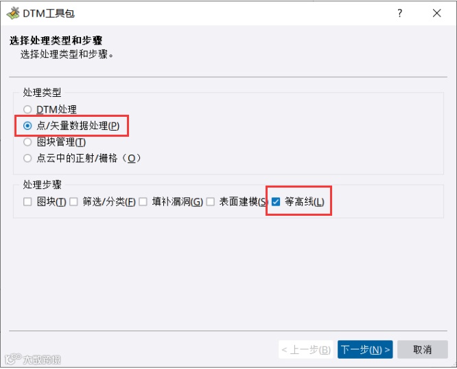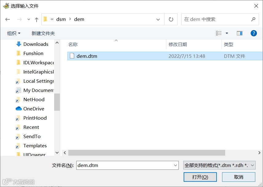 添加dem数据,选择*dtm或者*tpix.shp文件(需要*dtm格式而不是las格式,如果是las格式需要先进行表面建模或者可以勾选表面建模和等高线同时处理)。