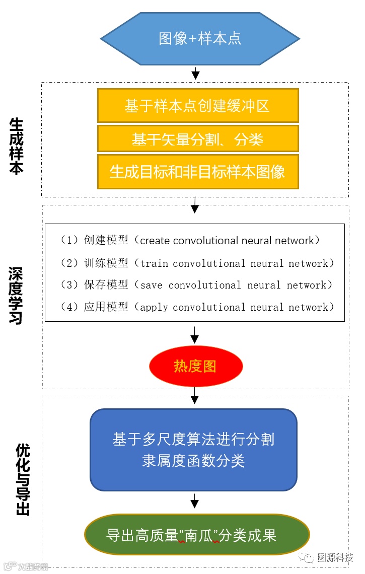 利用eCognition软件中的深度学习技术来对图像进行数据处理与“南瓜”识别。深度学习方法分类基本流程为:①创建模型;②训练模型;③保存模型;④应用模型。相关图像分析技术流程如下: