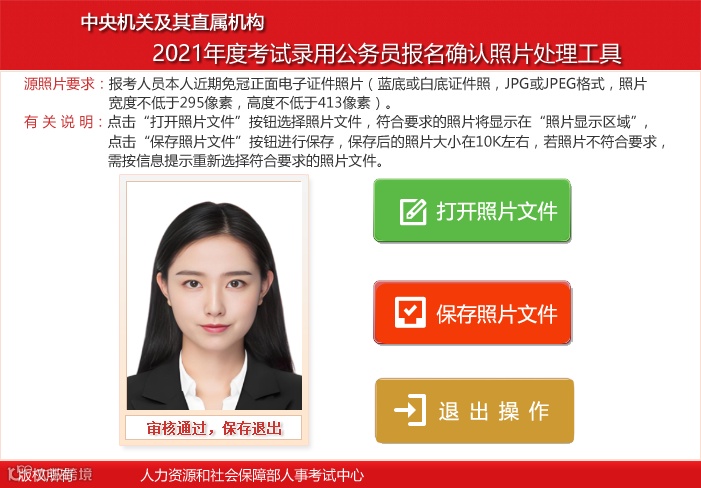 因为今年的国考报名已经过去了,所以具体的照片制作流程就先不写了,我就先给大家看下你们最有可能出错的部分吧。就是审核工具审核照片的时候,这两年的审核工具在照片审核的区域下面不显示文字了,就是一片空白,遇到这种情况,大家只要记得他不弹出照片不符合要求的字样那就正常审核照片保存并使用就行。因为照片如果有问题的话他会提示照片审核失败然后提示哪里哪里有问题。