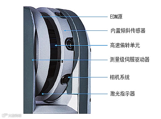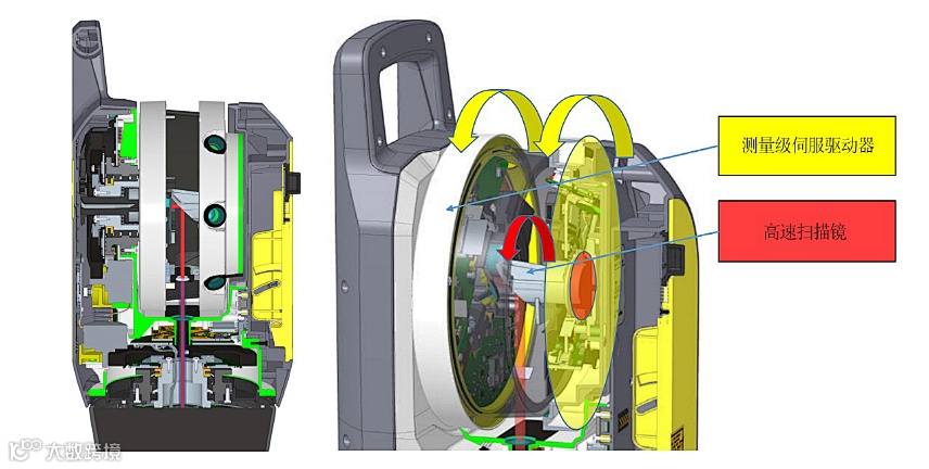 X-Drive双垂直偏转系统在扫描的高速偏转单元上使用了一个全站仪上著名的垂直伺服系统,开启了诸如自动校准、倾斜测量和激光指示器的新功能。全站仪垂直驱动和角度编码器系统仍然集成在照准部内,因此包括偏转单元和EDM源在内的整个中心单元可以像全站仪一样以传统方式围绕横轴旋转。