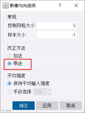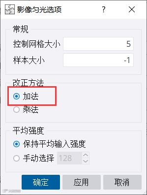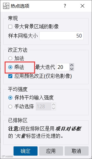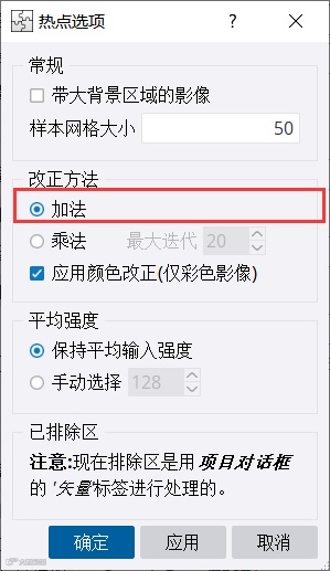 热点去除和强度匀色均包含加法和乘法这两种方法。采用不同的方法分别进行匀色处理,在“单一影像调整”选项下拉列表里选择“热点去除”或“强度匀色”,并选择校正方法。