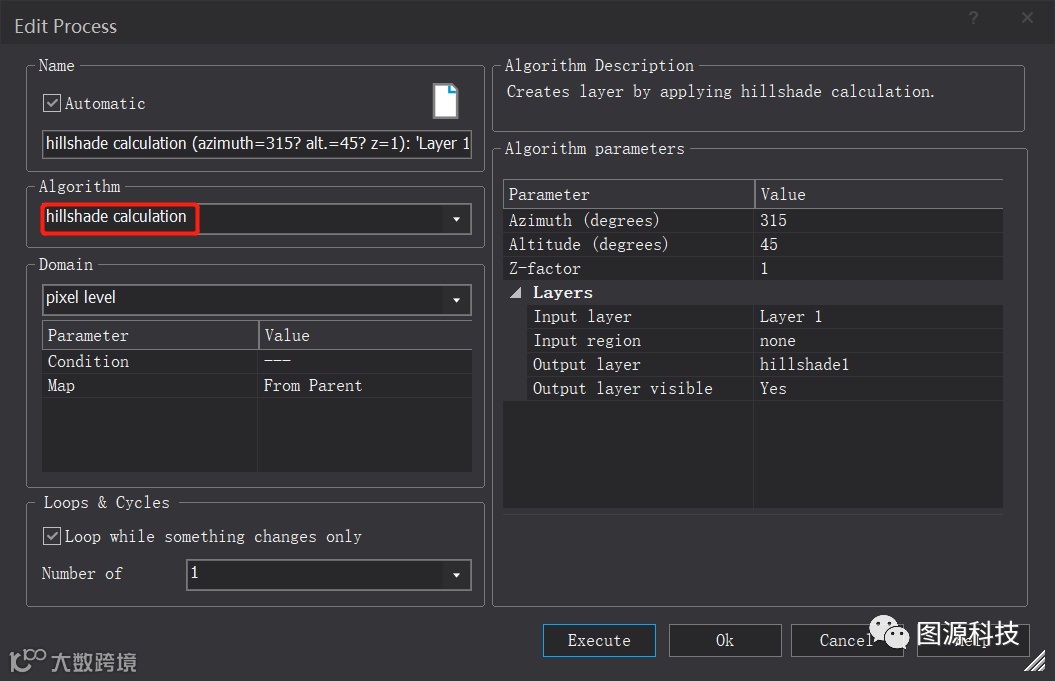 hillshade calculate算法基本设置界面