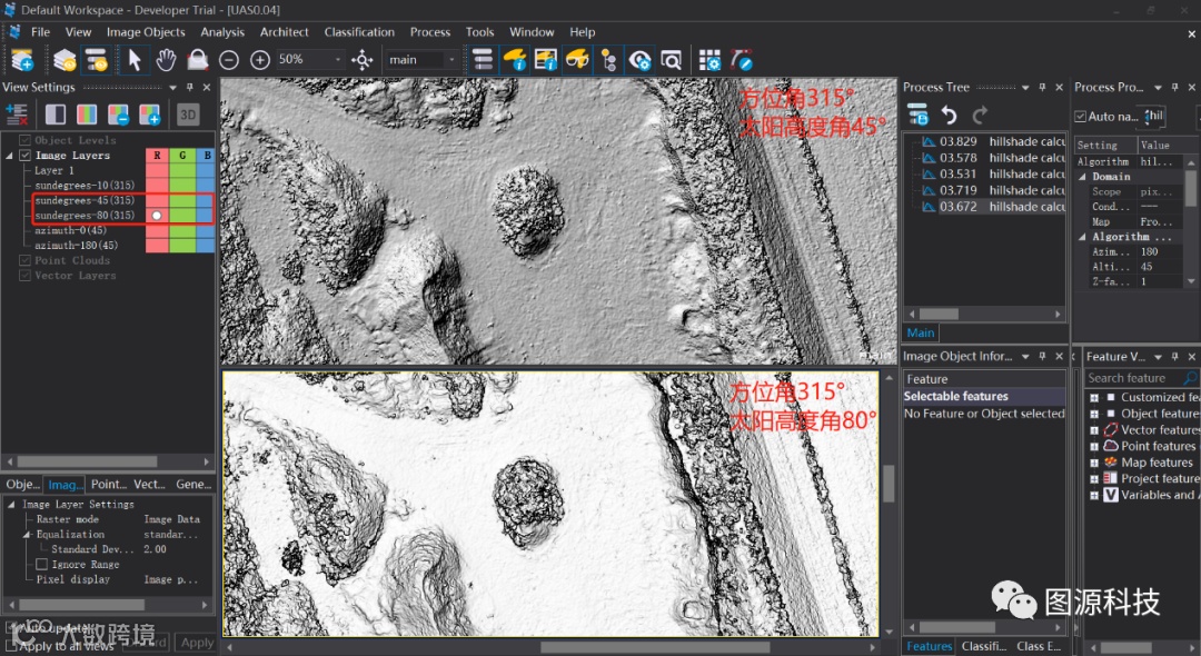 第二步:在进程树栏目中右击/Add new process,选择hillshade calculate算法,按照下方表1中的算法参数进行多次算法创建,通过变化方位角和太阳高度角(azimuth(degrees)&altitude(degrees))来得出不同的效果。如下所示: