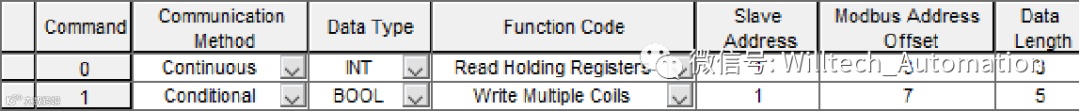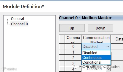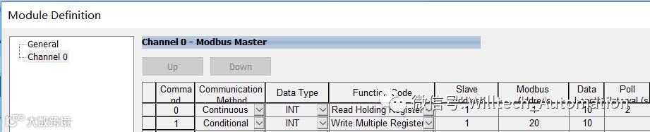 在Channel0中添加命令1,Conditional条件通讯、INT数据类型、从站地址1、初始地址20、数据长度10。