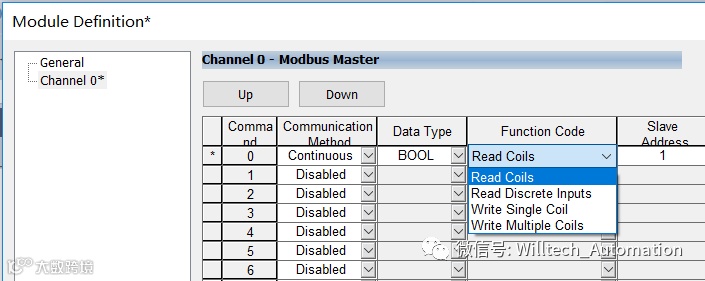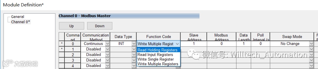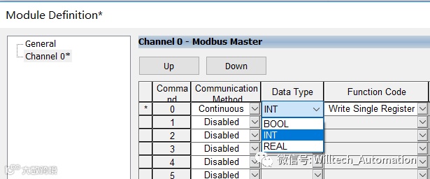 在Channel0中添加命令0,Continuous连续通讯、INT数据类型、从站地址1、初始地址1、数据长度10,轮询间隔2S。