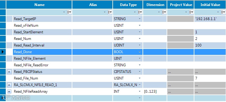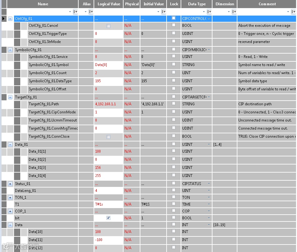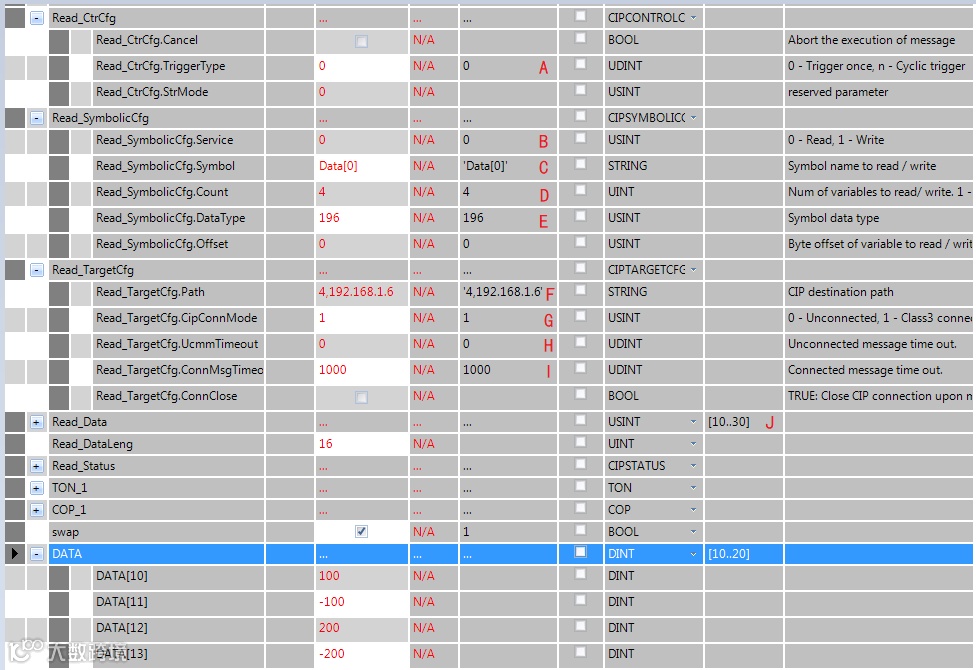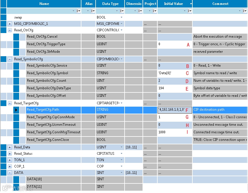 F—读/写数据的通讯路径,以太网端口固定为4,192.168.1.1为对应通讯处理器的地址