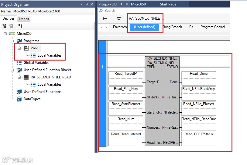 Micro820/850/870与Micrologix处理器之间通讯;功能块RA_MLX_NFILE_READ介绍如下: