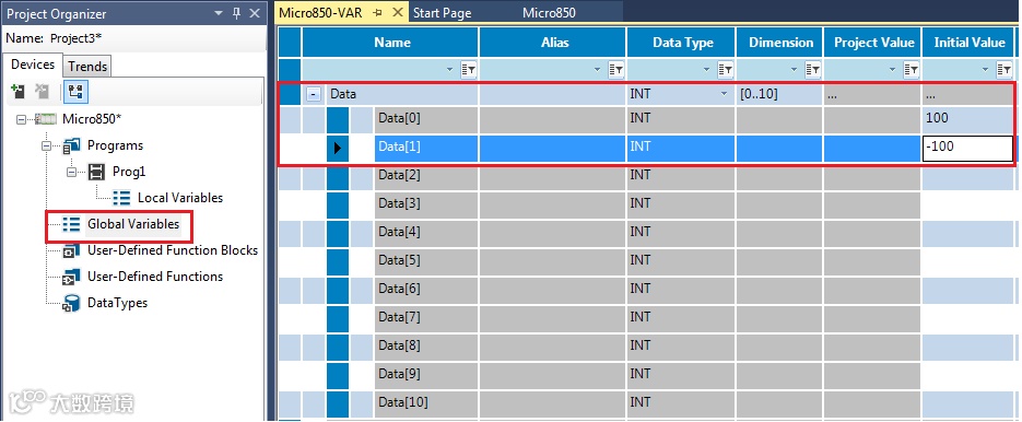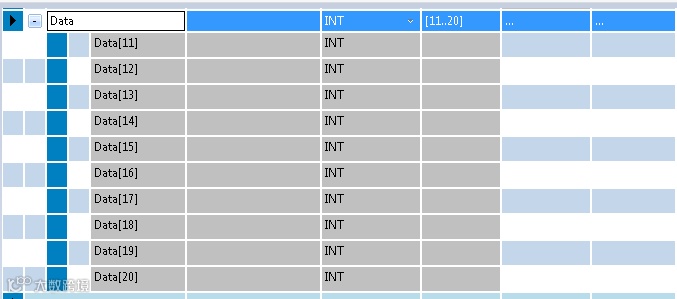4. 创建数据类型为INT的数组数据Data[11]和Data[12],变量范围没有限制,如图: