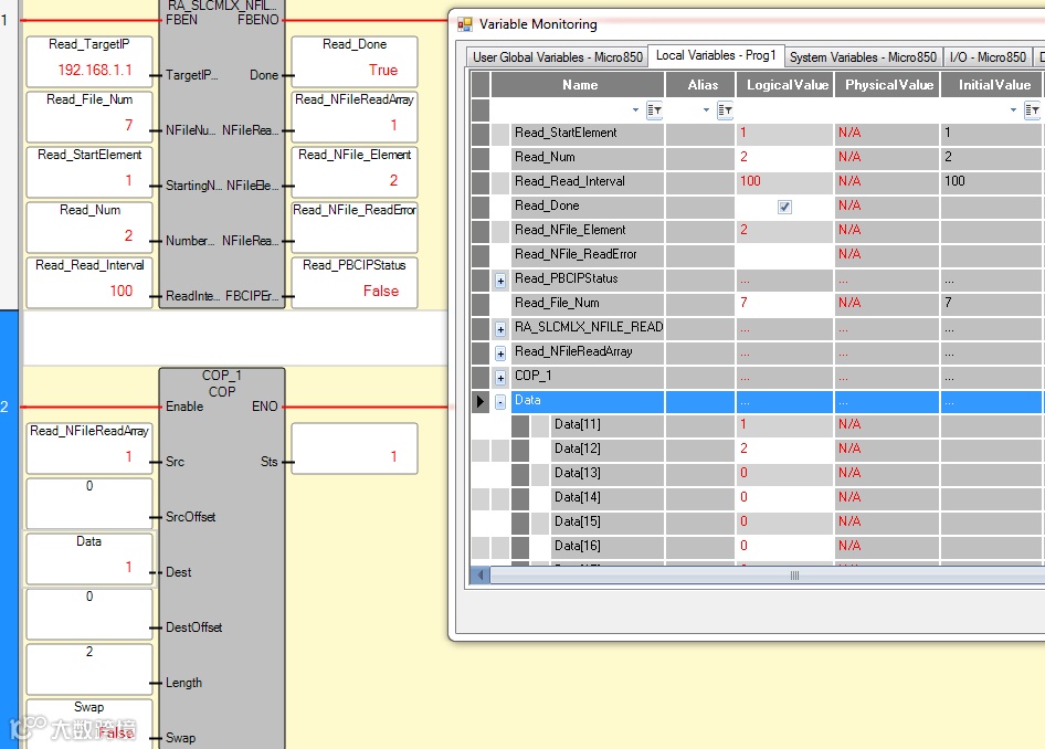读取Micro850程序INT类型数据Data[0],Data[1]存放到Micro850处理器Data[10],Data[11]中