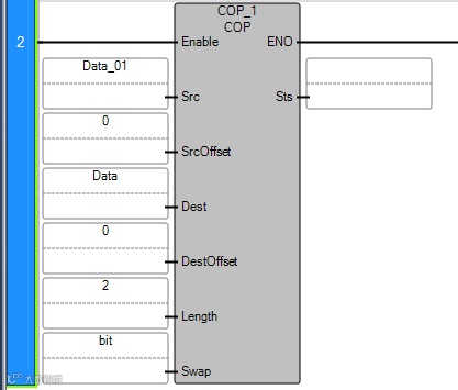 描述:将数据类型USINT的数组Data_01的数据作为数据源进行转换,数据地址偏移量为0,转换后的数据存储在数据类型为INT的数组Data中,偏移量是0,数据长度为2,bit设置为1,转换的数据高低字节交换;bit设置为0,转换的数据高低字节不交换,本例bit=1;这样Data_01[1], Data_01[2], Data_01[3], Data_01[4]存储到Data[10]和Data[11]中;