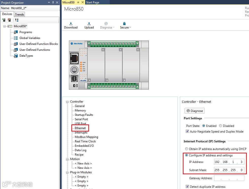1.创建项目,设置Micro850 IP地址:192.168.1.3