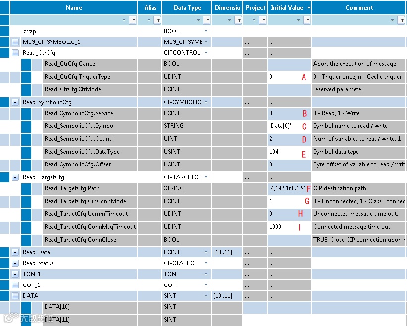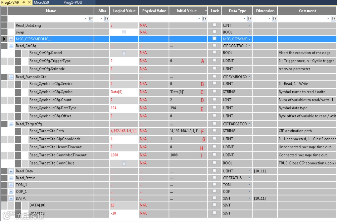 F—读/写数据的通讯路径,以太网端口固定为4,192.168.1.9为对应通讯处理器的地址