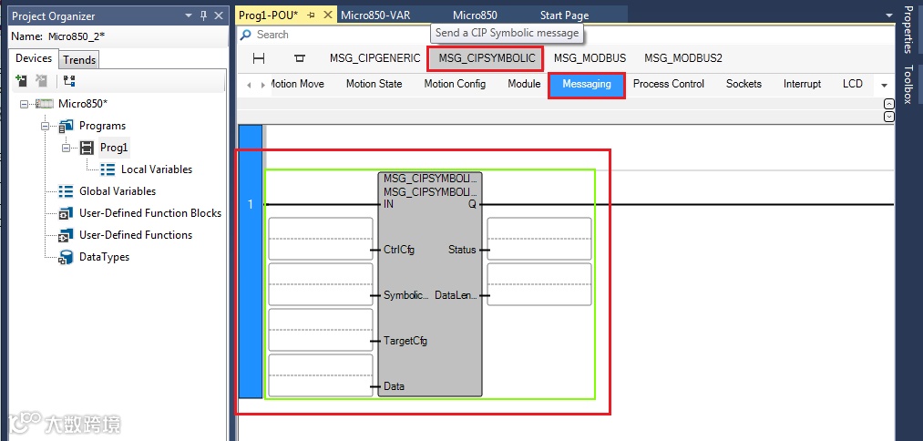在Messaging组中有4个指令,本例中需要使用MSG_CIPSIMBOLIC指令