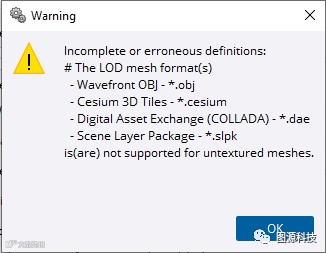 用户在通过Match-3DX模块创建3D网格时,如果要创建无纹理的3D网格成果,用户在选择输出格式时只能激活osgb 格式,如果激活其他格式,系统会弹出格式选择提示。