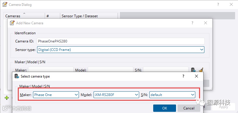 用户在处理飞思(PhaseOne)PAS 280相机获取的数据,创建工程时无需自定义相机参数,直接在数据库中进行选择设置。