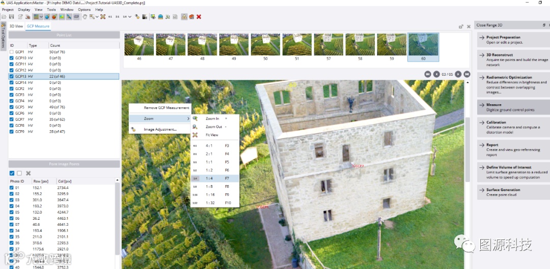 对于 UASMaster(近距离 3D/Close Range 3D)中的点测量,将保留选定的缩放级别(例如 4:1),以便进一步测量剩余图像中的点。