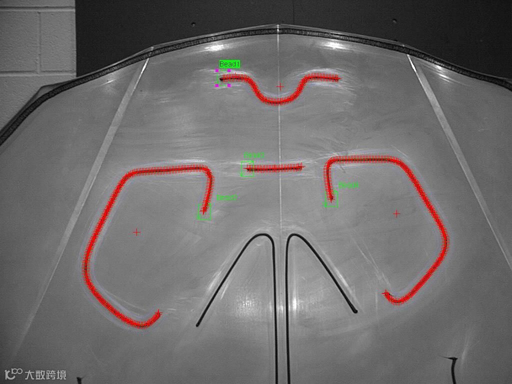 汽车的发动机罩壳在封装之前需要在周围涂上一圈密封胶,密封胶必须要均匀、 连续的,不能动开,需要对罩壳上的密封胶全部检测。