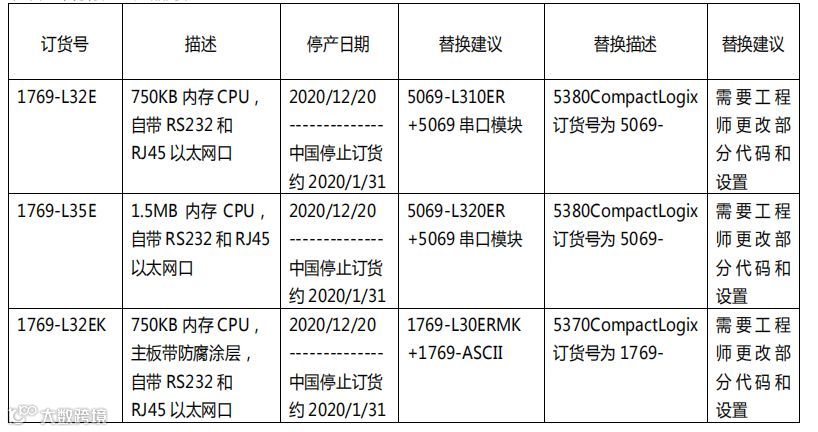 罗克韦尔自动化正式宣布部分 CompactLogix,型号为 1769-L3xE 的部分产品在 2020/12/20 正式宣布停产,不再接受客户订货。具体型号见下表(中国地区订货截止日期为 2020/1/31)