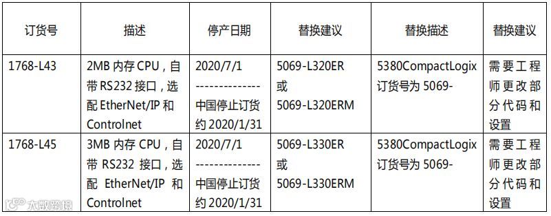 罗克韦尔自动化正式宣布部分 CompactLogix,型号为 1768-L4x 的部分产品在 2020/7/1 正式宣布停产,不再接受客户订货。具体型号见下表(中国地区订货截止日期为 2020/1/31)
