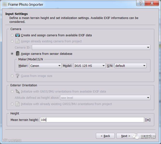 当导入影像时,相机参数直接从影像元数据(EXIF)中提取,如果用户知道相机类型,可指定一个相关的相机模板,或者通过分析影像文件假设一个相机类型。