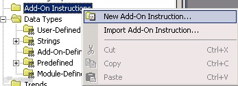 1.右键单击“用户自定义指令”(Add-On Instructions) 文件夹并选择“新建用户自定义指令”(New Add-On Instruction)。