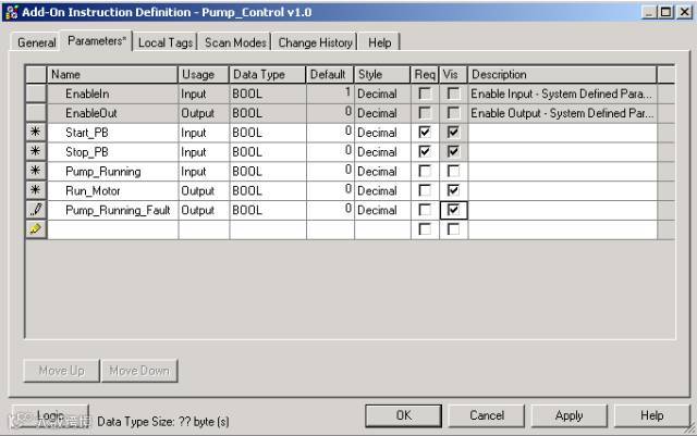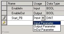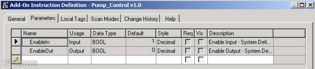 “可见”(Vis) - 如果为参数选中“可见”(Visible),则在例程中使用该指令时,它将默认为可见。根据指令实例所采用数据类型和语言(LD、FB、ST)的不同,使用此调节机制将产生不同的结果。