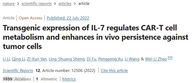 上海交通大学医学院附属瑞金医院/国家转化医学研究中心医学基因组学国家重点实验室团队在 Nature 旗下综合性科学期刊 Scientific Reports 发表文章“Transgenic expression of IL‑7 regulates CAR‑T cell metabolism and enhances in vivo persistence against tumor cells”,发现在CAR结构设计中引入IL-7,增强了CAR-T细胞的持久性,并诱导CAR-T细胞治疗后的持久缓解。