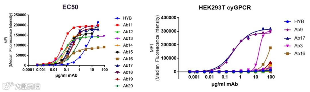 我们的用户MImAbs比较了Beacon®流程和杂交瘤方法在发现GPCR抗体方面的效率。在6次杂交瘤实验中,他们只筛得了一个hit, 而在Beacon®上他们筛得了84个hits。在重组表达后的药效验证实验中,由Beacon®筛得的大多数抗体分子的EC50远优于杂交瘤(HYB)筛得的分子(>10倍)。同时,在与猴抗原(cyGPCR)的交叉反应验证中,Beacon®筛得的2个抗体分子表现出了和人抗原相当的EC50活性。