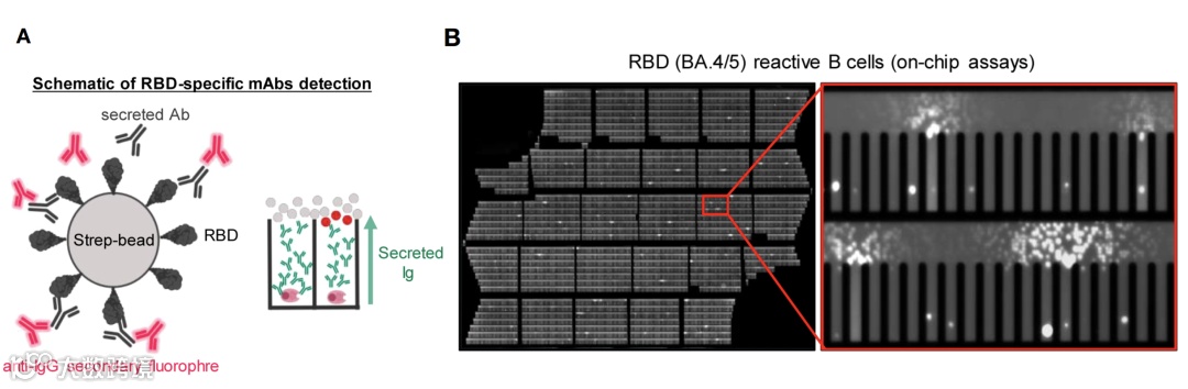 富集后的记忆B细胞经过8天激活成抗体分泌细胞,加载到Beacon®单细胞光导系统OptoSelect® 11k芯片上,持续新鲜灌注的培养基中含有促进浆细胞存活的添加物,使研究者能够对单个B细胞实现多轮的结合和功能筛选。作者首先测定数千个单B细胞分泌的IgG抗体是否有RBD结合活性。具体方法是:将生物素修饰的RBD(深灰色)与链霉亲和素偶联的聚苯乙烯珠(浅灰色)结合,然后加载到 NanoPens上方的通道中。单个B细胞将抗体(黑色Y形)分泌到各个NanoPens中,并用荧光anti-IgG二抗(红色)检测与RBD抗原结合的抗体。从NanoPen中扩散出来的反应性抗体被可视化为荧光“blooming”(图2A、B)。通过这种方法,研究者从NanoPens上4,246个单细胞中鉴定出137个RBD结合抗体。