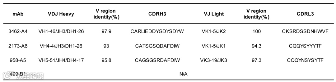 这四个细胞从芯片上导出,并对每个B细胞的重链和轻链基因进行测序,然后将其克隆到免疫球蛋白表达载体中。研究者成功地三个候选细胞中获得了编码VH和VL的基因信息(图2E)。