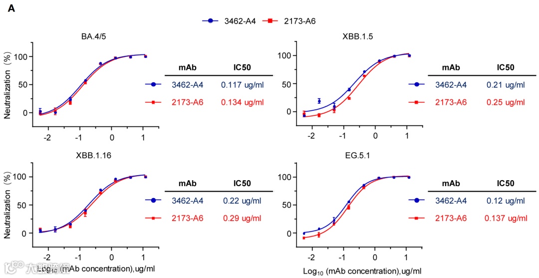 研究者表达纯化了单克隆抗体(mAb)958-A5、2173-A6和3462-A4。ELISA结合测定证明2173-A6和3462-A4与RBD(BA.4/5)抗原发生有效反应,EC50值为0.04ug/ml(图3A)。两种抗体也均能与多种SARS-CoV-2 Omicron谱系(包括XBB.1.16、XBB.1.5和EG.5.1)的RBD有效反应(图3A)。使用基于表面等离子共振 (SPR) 的光学测定法监测2173-A6和3462-A4与SARS-CoV-2 Omicron谱系RBD结合的实时结合和解离。两种抗体对每个Omicron谱系都表现出相似的RBD结合亲和力(图 3B)。2173-A6和3462-A4对Omicron BA.4/5、XBB.1.5和EG.5.1的RBD显示出快结合/慢解离动力学,然而,针对Omicron XBB.1.16的RBD表现出快结合/快解离动力学特征(图 3B)。总体而言,这些结果表明2173-A6和3462-A4与多个SARS-CoV-2 Omicron谱系的RBD发生强烈反应。
