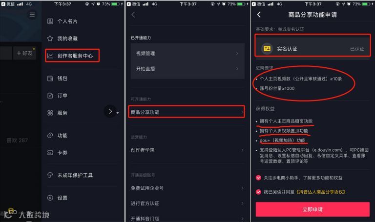 近日,抖音更新了平台橱窗开通权限。用户只需在“创作者服务中心”点击“商品分享功能”,完成实名认证后即可开通橱窗功能,链入淘宝、京东、考拉、唯品会等第三方平台的巨大商品库。