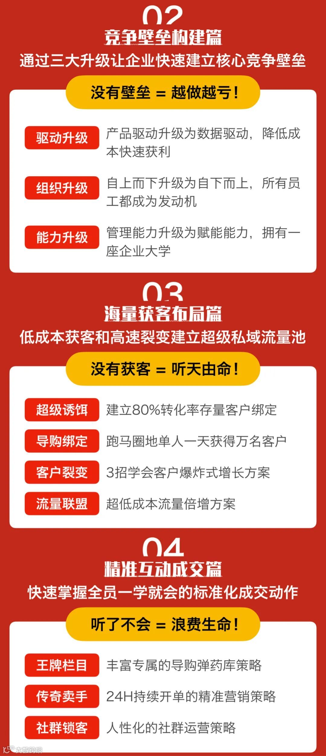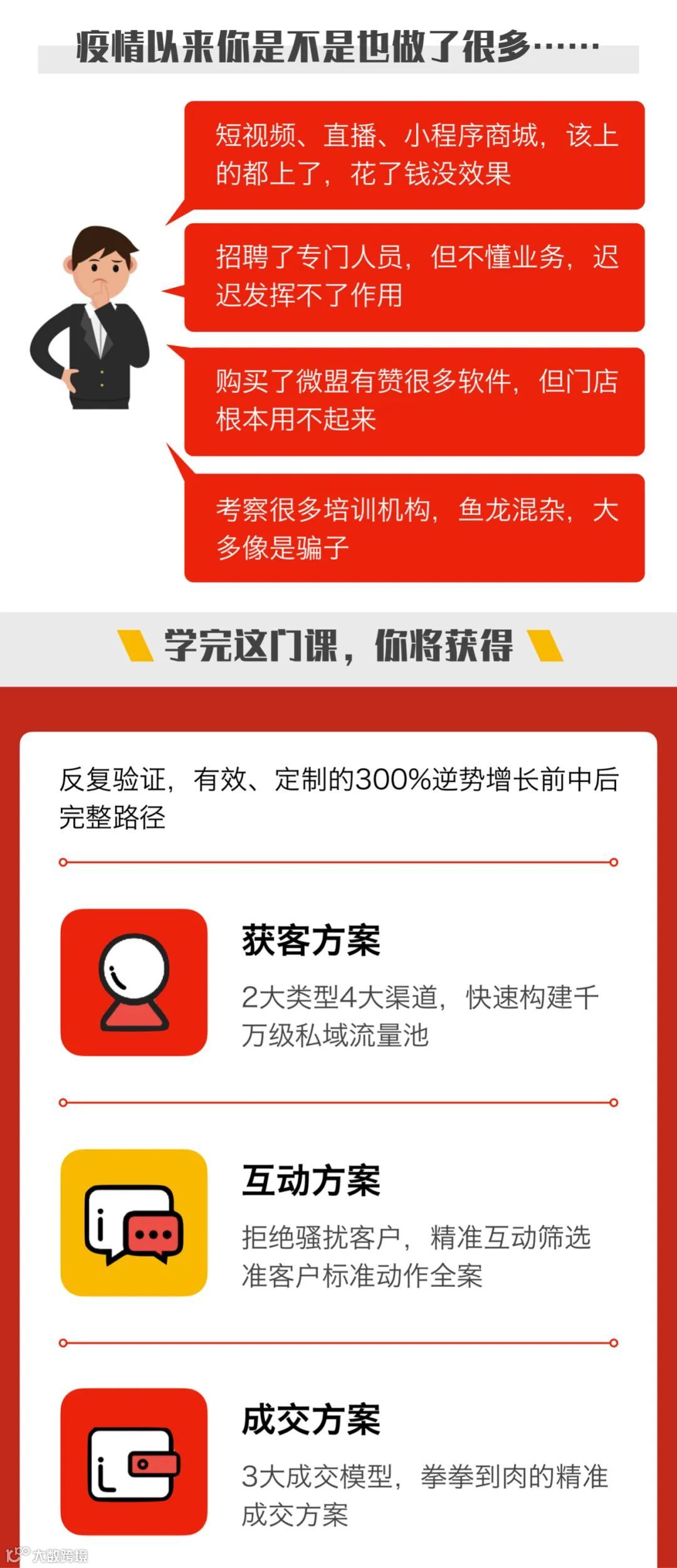本次课程共分为6大版块,共解决“乱打乱撞”、“没有壁垒”、“没有获客”、“听了不会”、“没有套路”、“不搞团队” 6大现状与痛点,它们正是在企业新零售道路上的绊脚石,同时,用20个核心知识点配合上百个实操知识与案例,为学员完成企业在新零售数字化道路上最重要的转型。