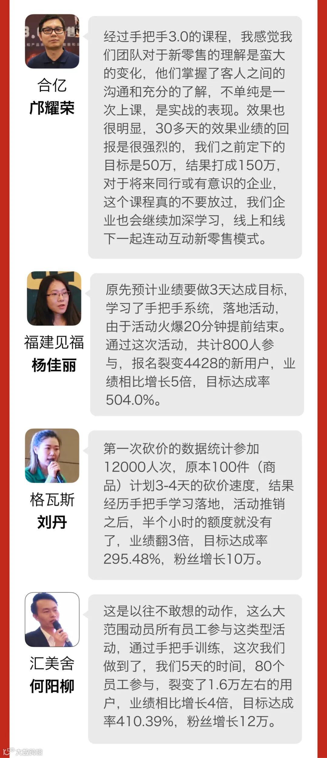 南京石榴姐 两天的课程让我们感受到了传统门店向新零售转型的重要性,很需要立刻执行起来。我们公司已经正在筹备新零售的项目,首先就要按照老师说的,成立一个战时小组,确定核心领导和分工,然后进行整体框架的布局,在运用老师传授的战术进去,比如直播的和话术的。金菲老师和郭冰老师都很棒,既幽默,课又讲的很好。 |