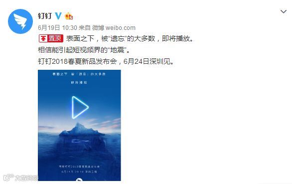 近日,钉钉官方微博在2018春夏新品发布的宣传文案中写道,表面之下,被“遗忘”的大多数,即将播放。相信能引起短视频界的“地震”。隐隐指向钉钉入局短视频。就此,钉钉公关部表示:不予置评。