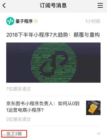 1)“标题+封面图”的展示形式提醒公众号运营者“找一张吸引眼球的头图和起一个有吸引力的标题”一样重要;2)所有账号按最近群发送达时间先后展示,最新发布的内容在最上方;3)每个公众号最多只显示2条推送文章,剩余的被折叠起来,点击“余下篇数”才能显示;